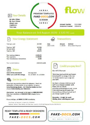 United Kingdom Flow Energy utility bill template in Word and PDF format