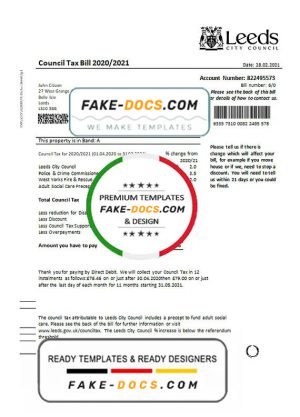 United Kingdom Leeds City Council tax bill template in Word and PDF format