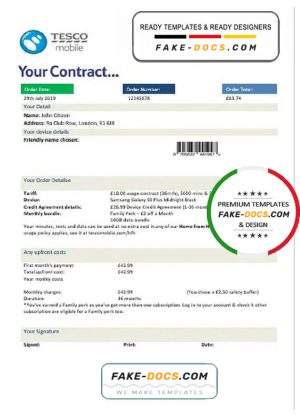 United Kingdom Tesco Mobile utility bill template in Word and PDF format