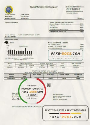 USA Hawaii Water Service Company utility bill template in Word and PDF (.doc and .pdf) format