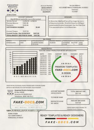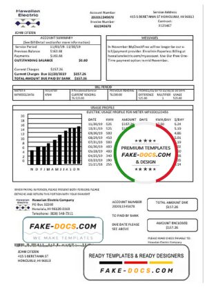 USA Hawaiian Electric utility bill template in Word and PDF format (.doc and .pdf)