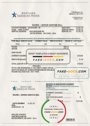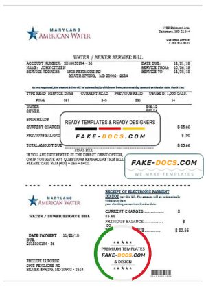 USA Maryland American water utility bill template in Word and PDF format