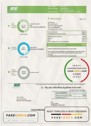 USA Maryland Baltimore Gas and Electric (BGE) utility bill template in Word and PDF format
