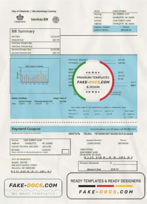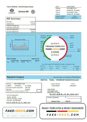 USA North Carolina City of Charlotte water utility bill template in Word and PDF format
