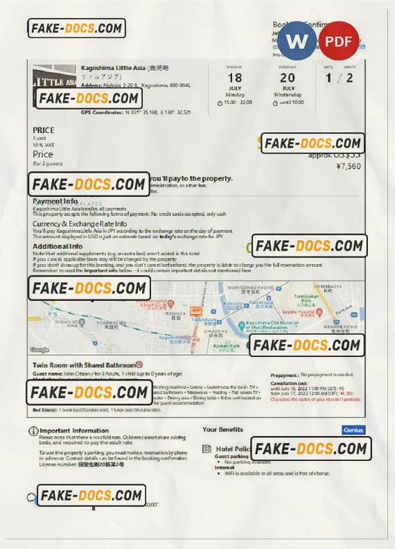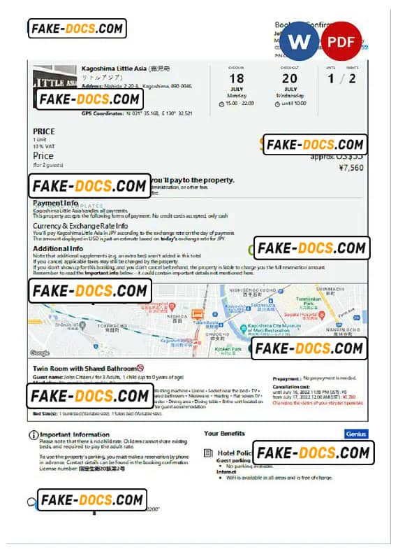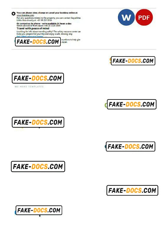 Japan hotel booking confirmation Word and PDF template, 2 pages