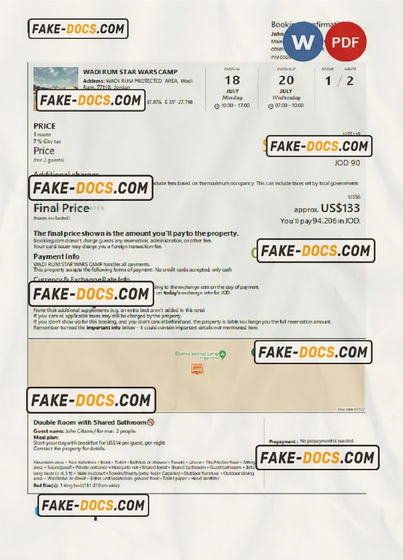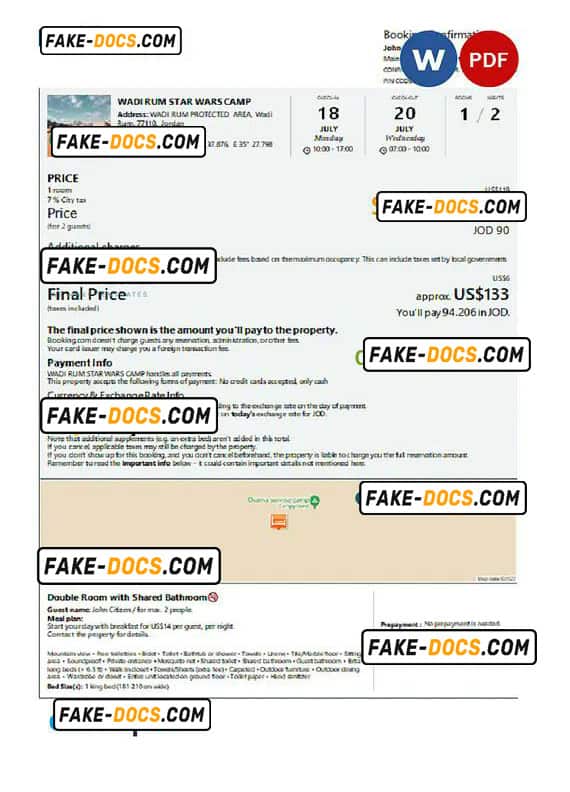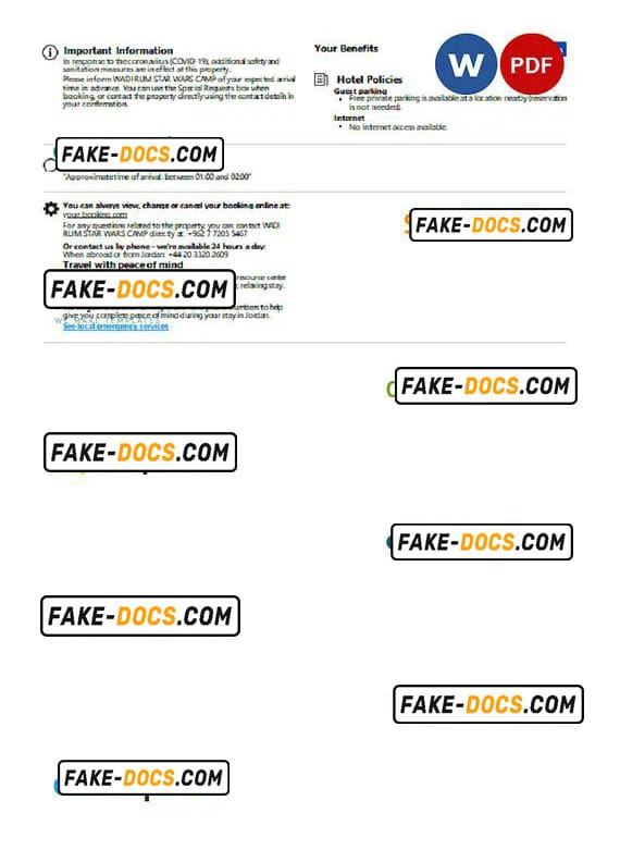 Jordan hotel booking confirmation Word and PDF template, 2 pages