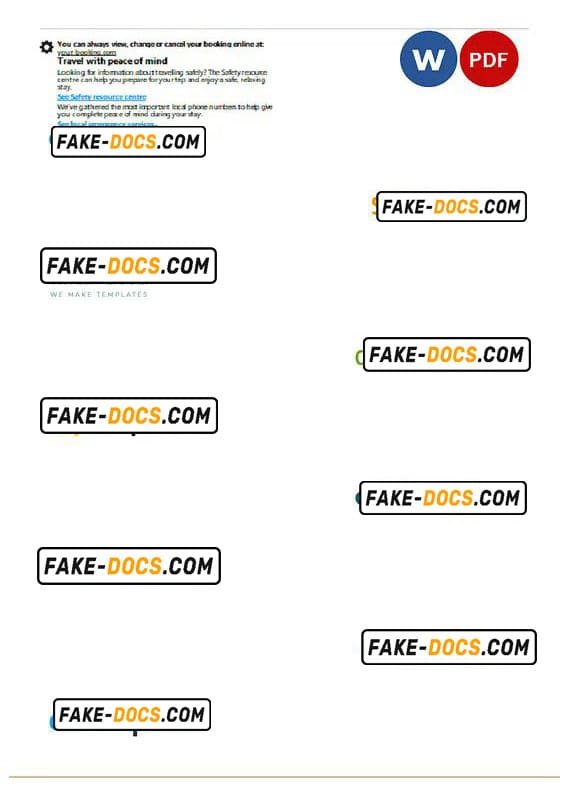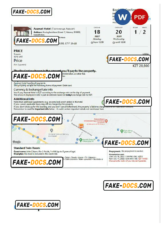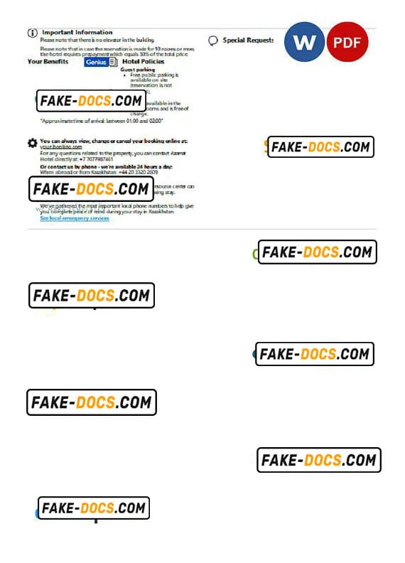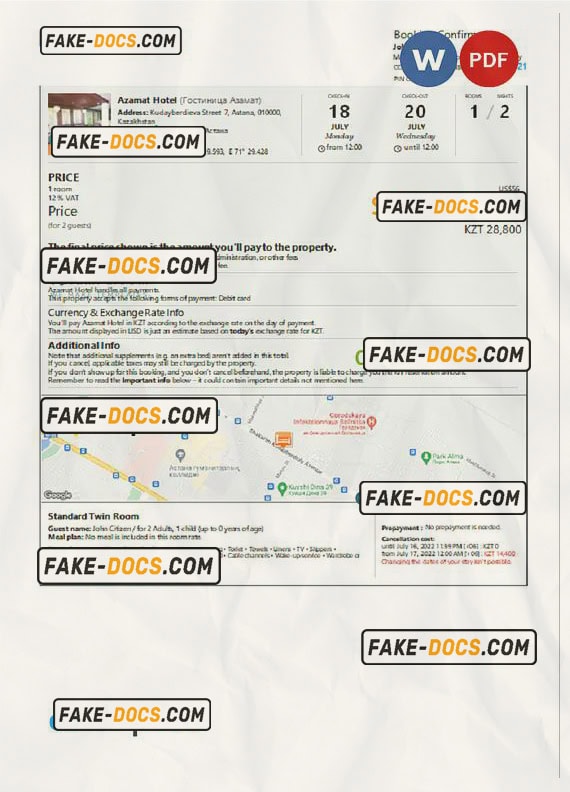 Kazakhstan hotel booking confirmation Word and PDF template, 2 pages