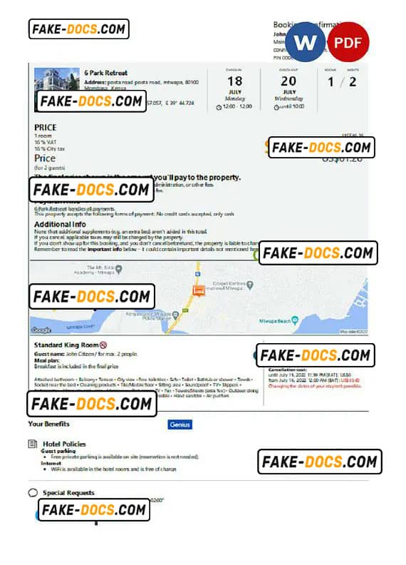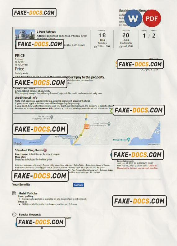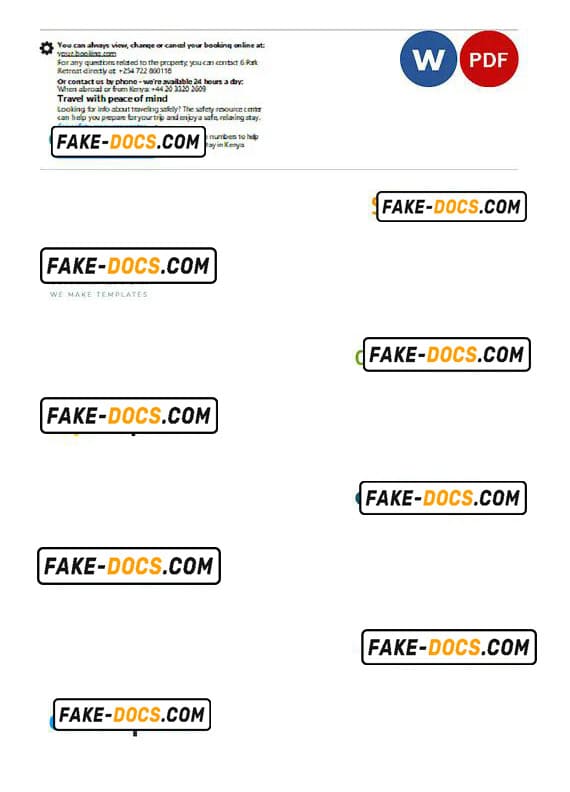Kenya hotel booking confirmation Word and PDF template, 2 pages