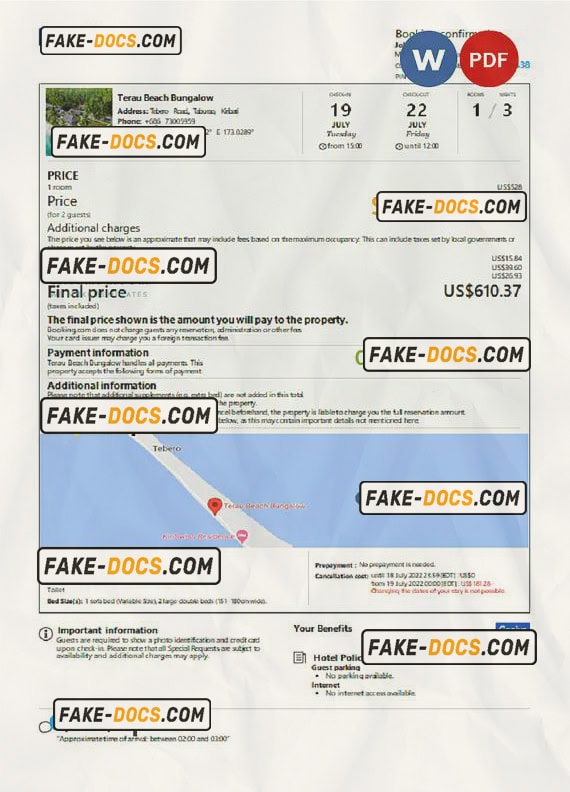 Kiribati hotel booking confirmation Word and PDF template, 2 pages