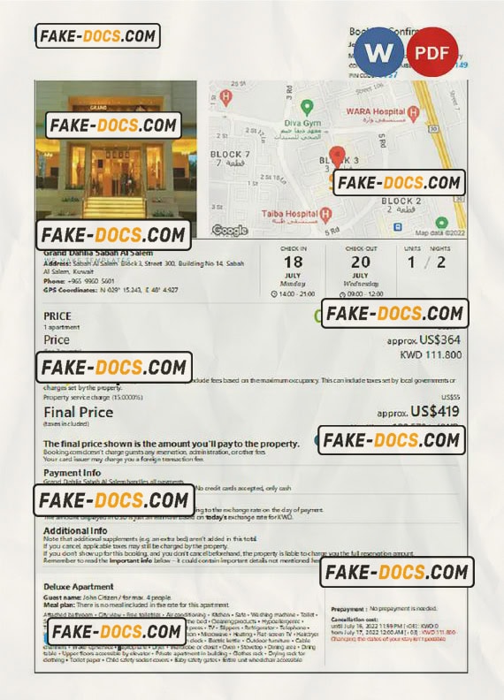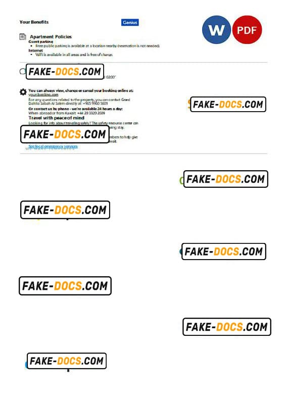 Kuwait hotel booking confirmation Word and PDF template, 2 pages