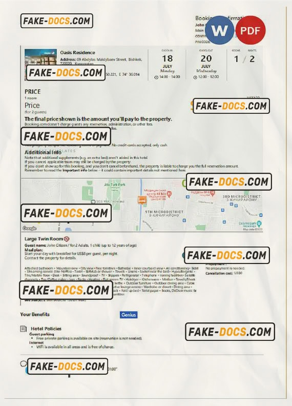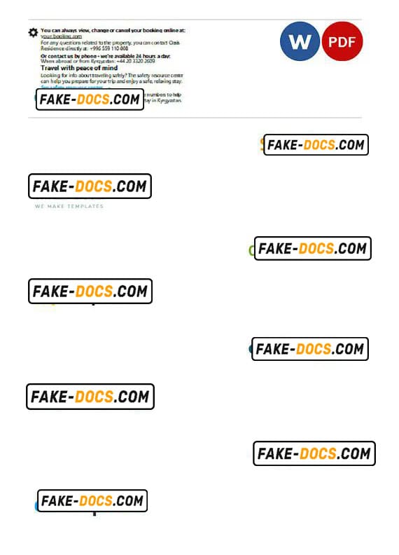 Kyrgyztsan hotel booking confirmation Word and PDF template, 2 pages
