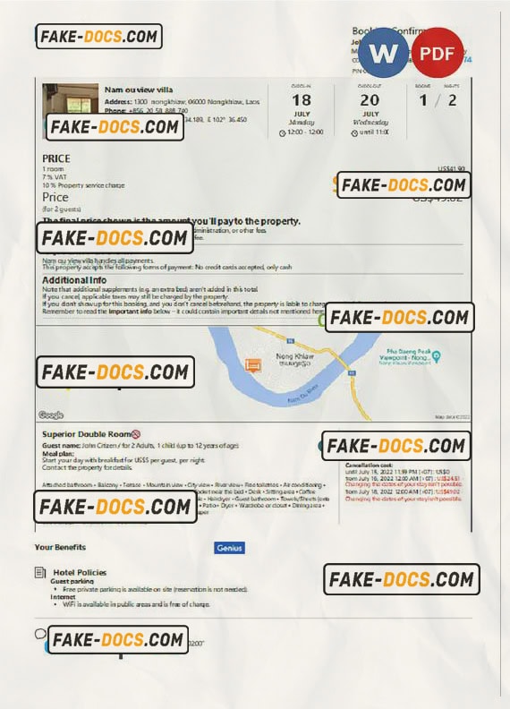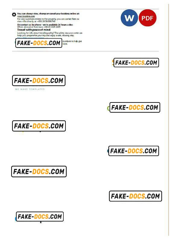Laos hotel booking confirmation Word and PDF template, 2 pages