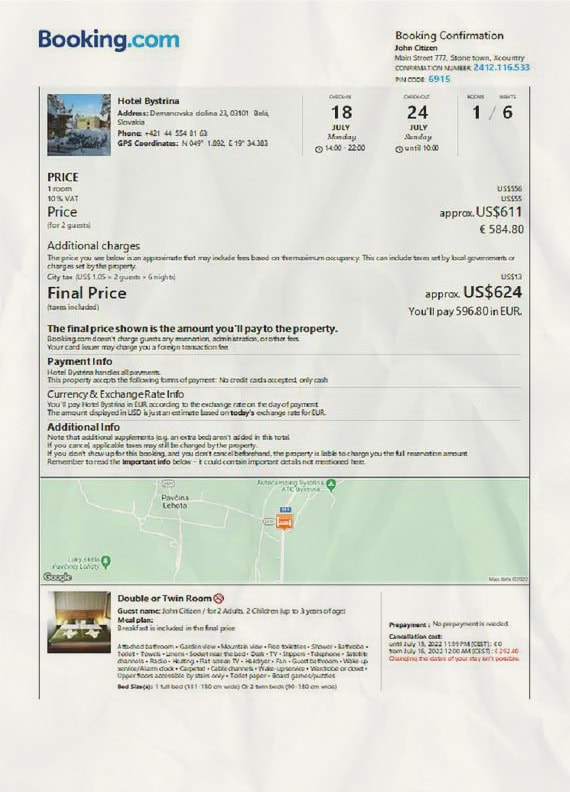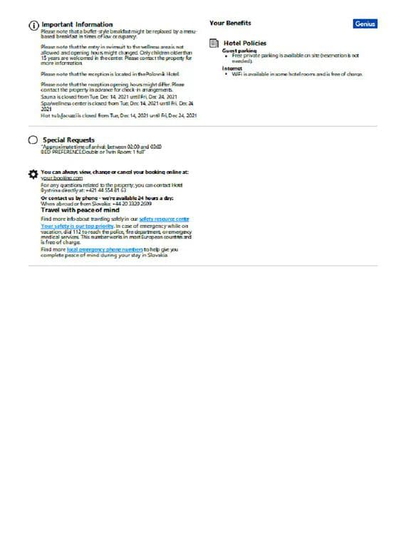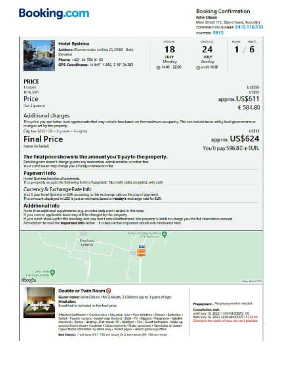 Slovakia hotel booking confirmation Word and PDF template, 2 pages