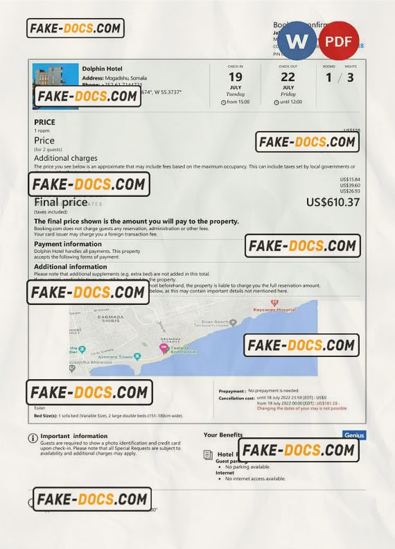 Somalia hotel booking confirmation Word and PDF template, 2 pages