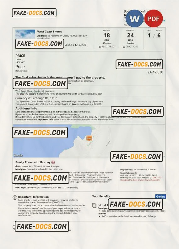 South Africa hotel booking confirmation Word and PDF template, 2 pages