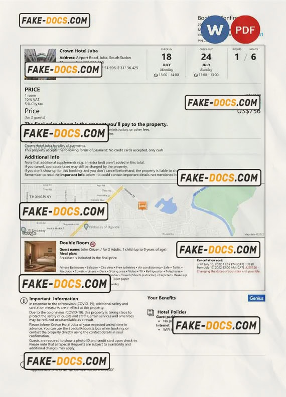 South Sudan hotel booking confirmation Word and PDF template, 2 pages