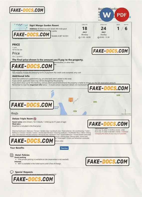 Sri Lanka hotel booking confirmation Word and PDF template, 2 pages