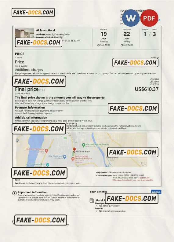 Sudan hotel booking confirmation Word and PDF template, 2 pages