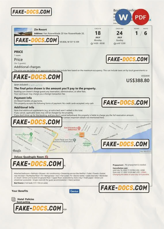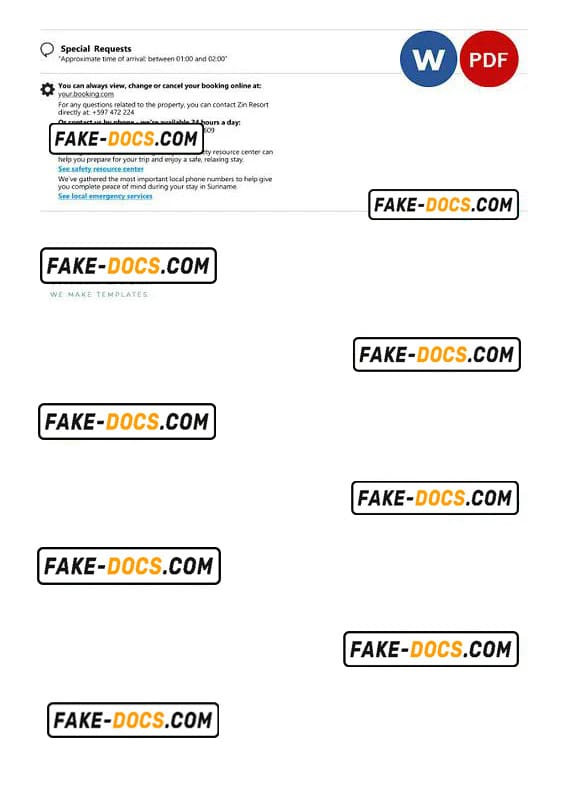 Suriname hotel booking confirmation Word and PDF template, 2 pages