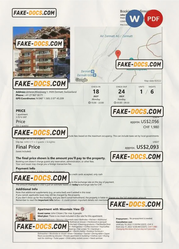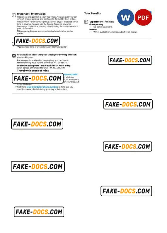 Switzerland hotel booking confirmation Word and PDF template, 2 pages