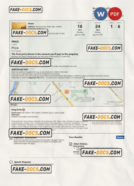 Tajikistan hotel booking confirmation Word and PDF template, 2 pages
