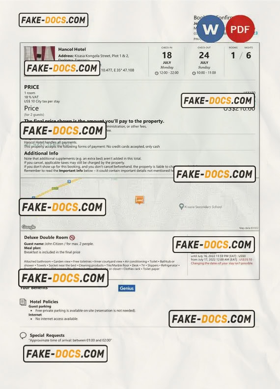 Tanzania hotel booking confirmation Word and PDF template, 2 pages