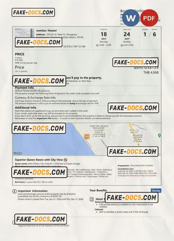 Thailand hotel booking confirmation Word and PDF template, 2 pages