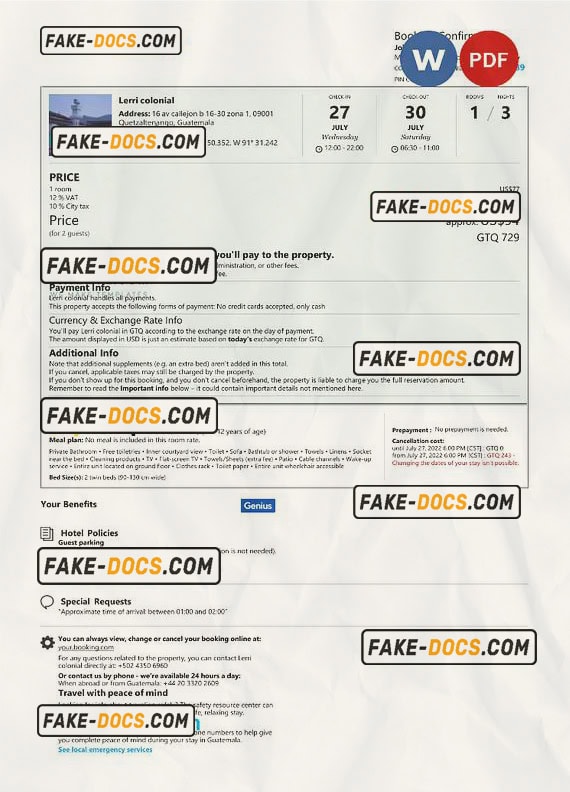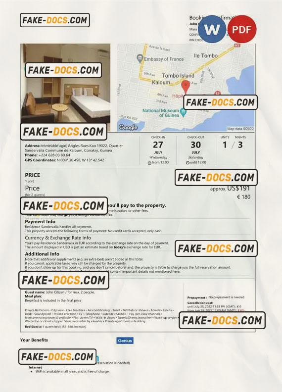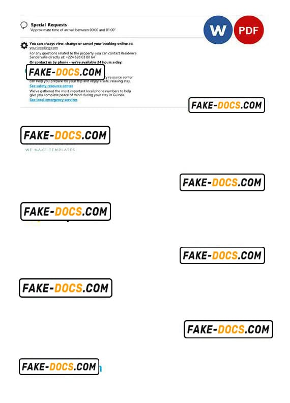 Guinea hotel booking confirmation Word and PDF template, 2 pages