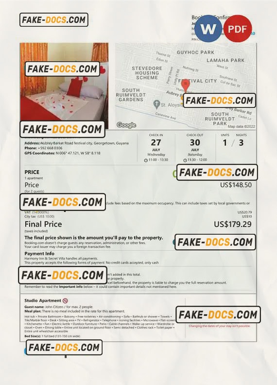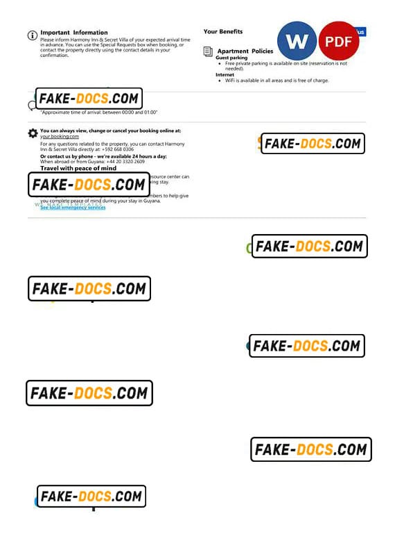 Guyana hotel booking confirmation Word and PDF template, 2 pagesc