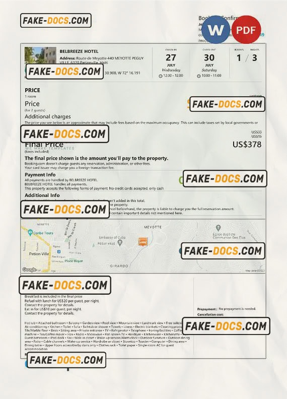 Haiti hotel booking confirmation Word and PDF template, 2 pages