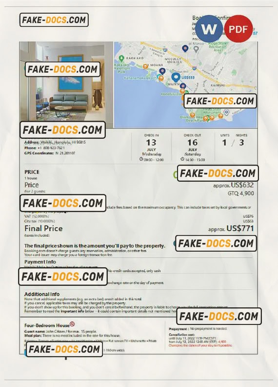Hawaii hotel booking confirmation Word and PDF template, 2 pages
