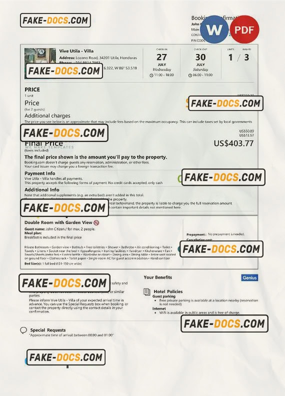 Honduras hotel booking confirmation Word and PDF template, 2 pages