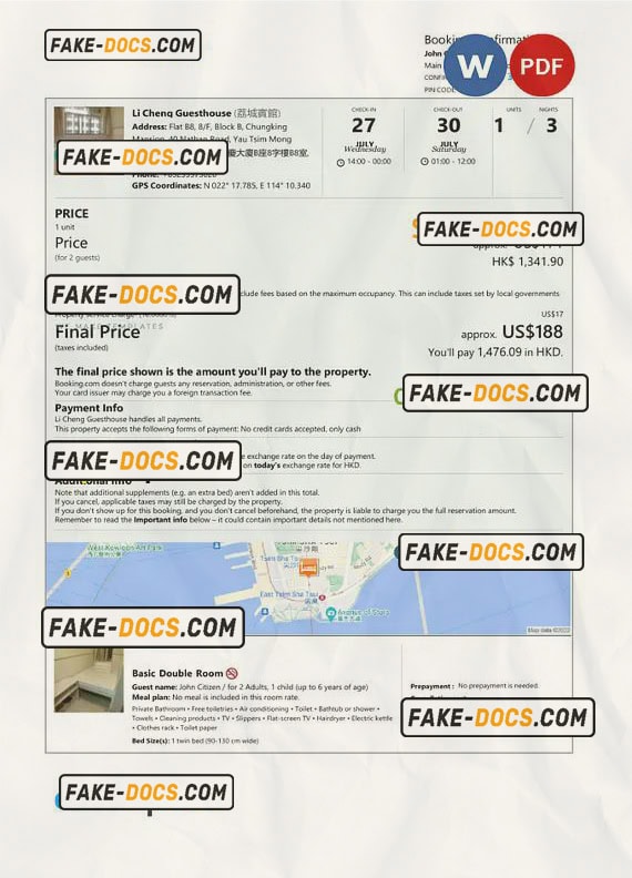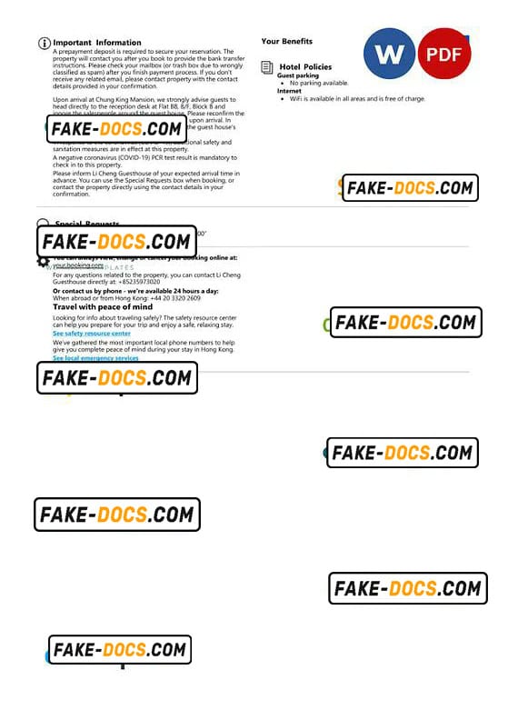 Hong Kong hotel booking confirmation Word and PDF template, 2 pages