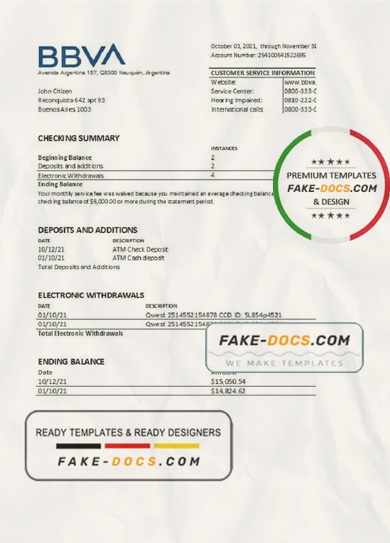 Grab now fully editable Argentina BBVA Bank Statement Excel Template from our website Fake Docs and put your own info to create Fake Bank Statement template Excel and ready your own novelty documents. It’ll be so beneficial if your Bank Statement is expired, stolen or not available. We also have passport psd template, ID Card psd template, Bank Statement psd template, drivers license psd template & Utility bill psd template