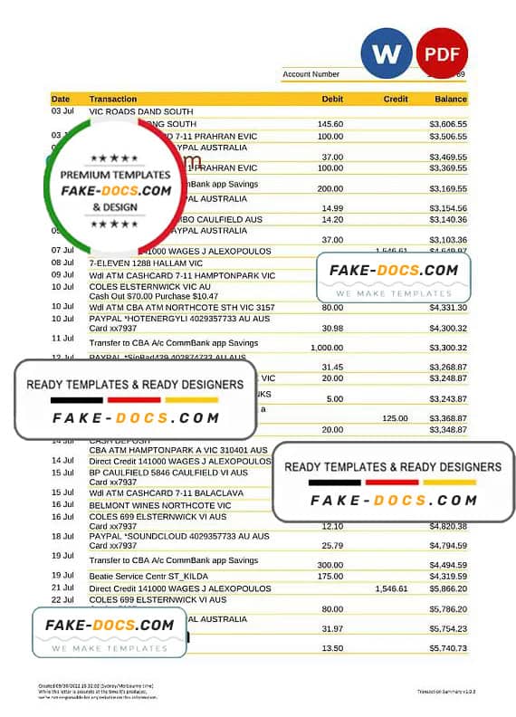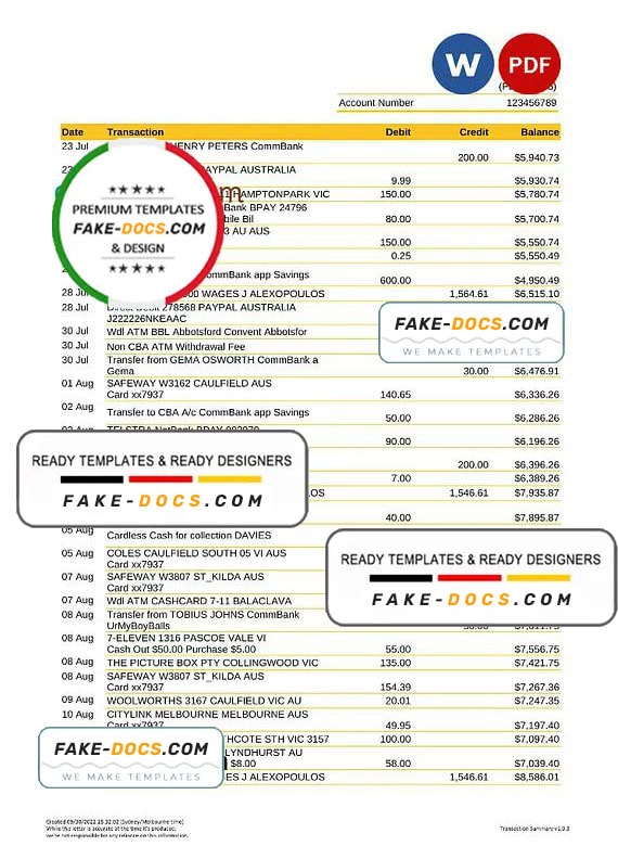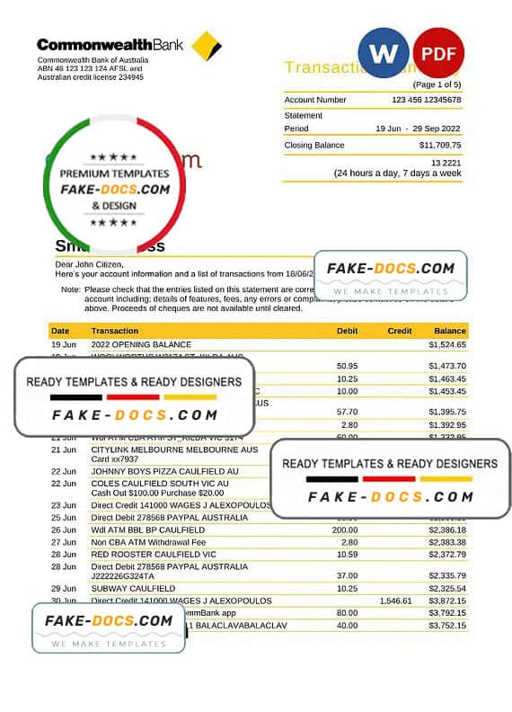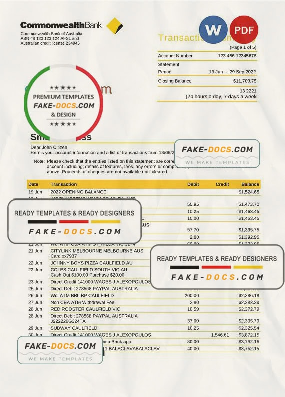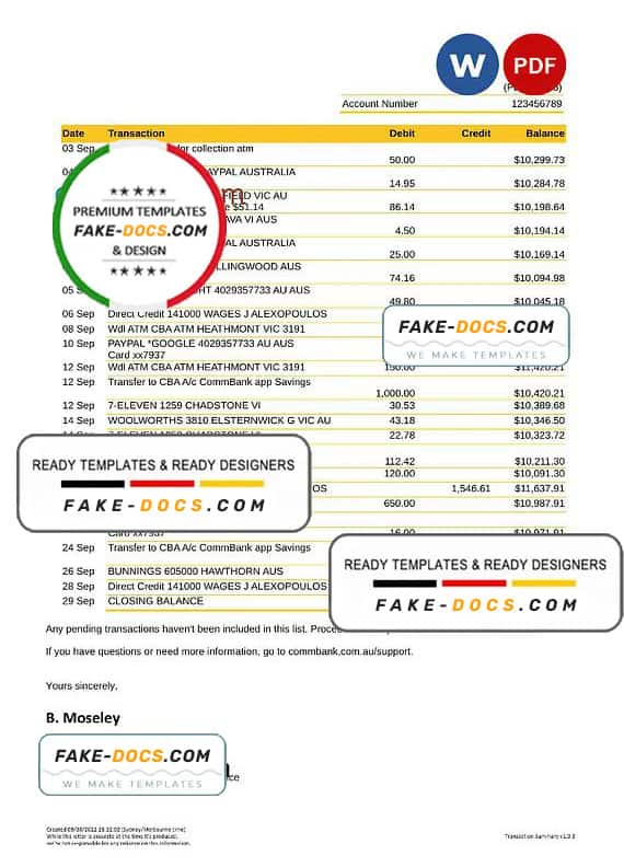 Australia Commonwealth Bank Statement Word template . Fully editable Word template. High quality template. Easy to customize, Layer based, fonts included. you can edit this template and put any name, address, license number, Id number, birth date, height, weight, expire date, change photos etc. This Word template is a easy to Editing.To modify this Word template file you will need a Word editing software such as Microsoft Word. Never used low quality template. Your account may be suspended.
