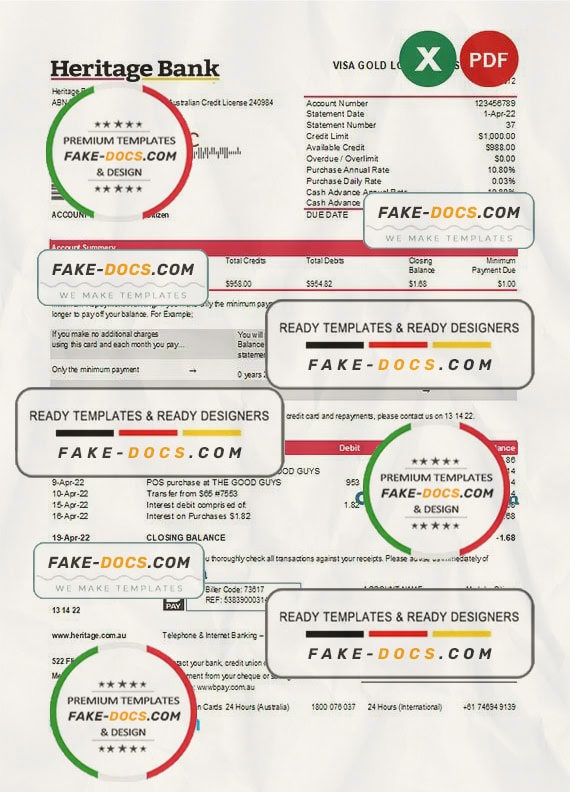Australia Heritage Bank Statement template Excel. Fully editable Excel template. High quality template. Easy to customize, fonts included. you can edit this template and  put any name, address, license number, Id number, birth date, height, weight, expire date, change photos etc. This Excel template is a easy to Editing.To modify this Excel template file you will need a Excel editing software such as Microsoft Excel. Never used low quality template. Your account may be suspended.