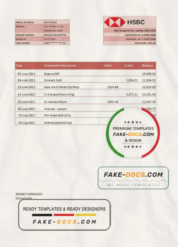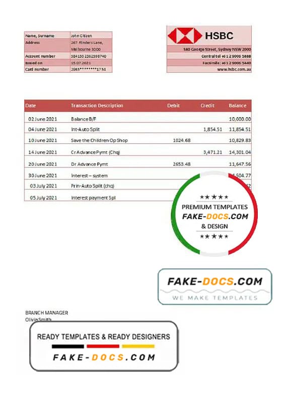 Grab now fully editable Australia HSBC Bank Statement Excel Template from our website Fake Docs and put your own info to create Fake Bank Statement template Excel and ready your own novelty documents. It’ll be so beneficial if your Bank Statement is expired, stolen or not available. We also have passport psd template, ID Card psd template, Bank Statement psd template, drivers license psd template & Utility bill psd template