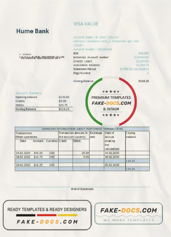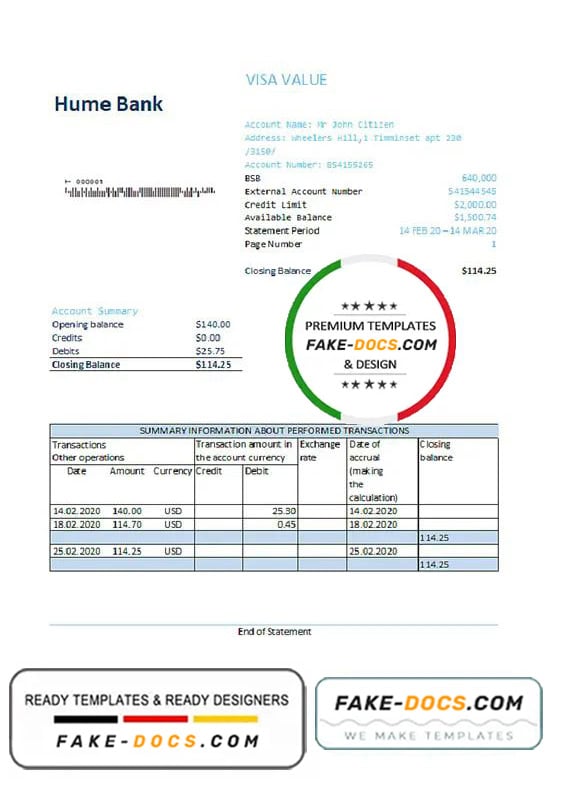 Grab now fully editable Australia Humebank Bank Statement Excel Template from our website Fake Docs and put your own info to create Fake Bank Statement template Excel and ready your own novelty documents. It’ll be so beneficial if your Bank Statement is expired, stolen or not available. We also have passport psd template, ID Card psd template, Bank Statement psd template, drivers license psd template & Utility bill psd template
