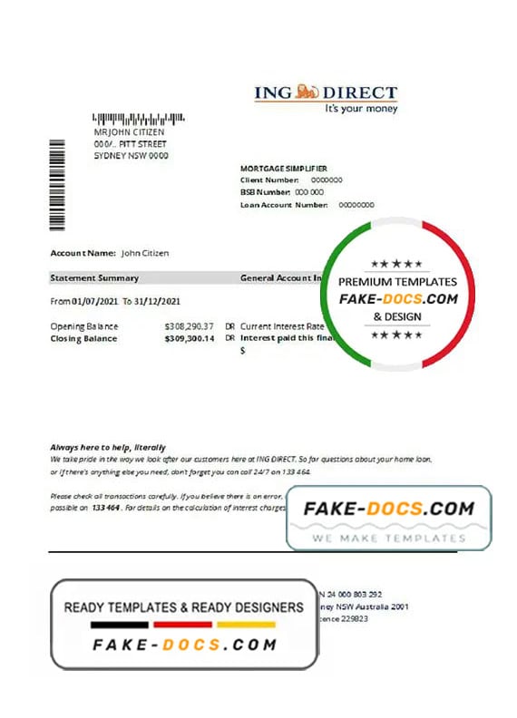 Grab now fully editable Australia ING Direct Bank Statement Excel Template from our website Fake Docs and put your own info to create Fake Bank Statement template Excel and ready your own novelty documents. It’ll be so beneficial if your Bank Statement is expired, stolen or not available. We also have passport psd template, ID Card psd template, Bank Statement psd template, drivers license psd template & Utility bill psd template