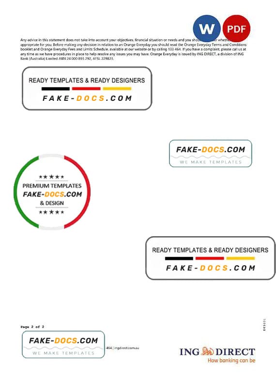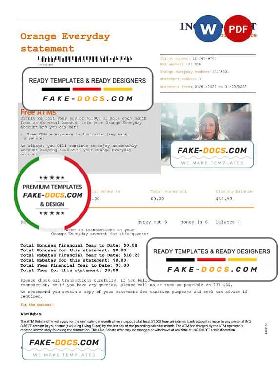 Australia ING Direct Bank Statement Word template . Fully editable Word  template. High quality template. Easy to customize, Layer based, fonts included. you can edit this template and  put any name, address, license number, Id number, birth date, height, weight, expire date, change photos etc. This Word  template is a easy to Editing.To modify this Word template file you will need a Word editing software such as Microsoft Word. Never used low quality template. Your account may be suspended.