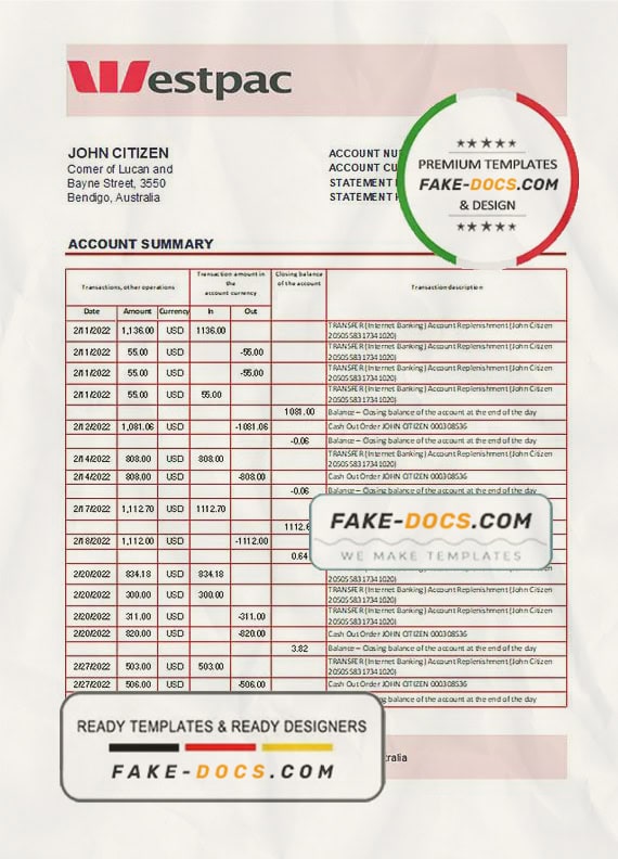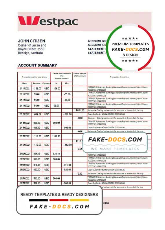 Grab now fully editable Australia Westpac Bank Statement Excel Template from our website Fake Docs and put your own info to create Fake Bank Statement template Excel and ready your own novelty documents. It’ll be so beneficial if your Bank Statement is expired, stolen or not available. We also have passport psd template, ID Card psd template, Bank Statement psd template, drivers license psd template & Utility bill psd template
