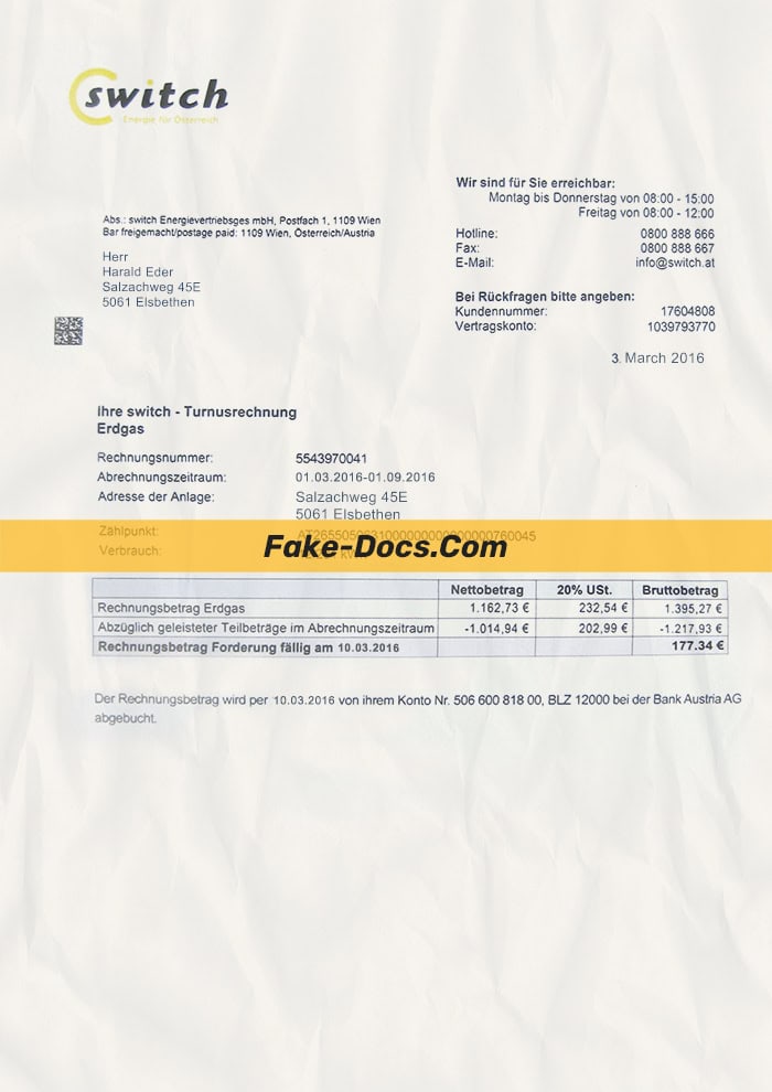 Grab now fully editable Austria Switch proof of address psd template from our website fake docs and put your own info to create a fake copy of Fake Austria Switch utility bill psd template and ready your own novelty documents. It’ll be so beneficial if your ID Card is expired, stolen or not available. We also have passport psd template, ID Card psd template, Bank Statement psd template, drivers license psd template & utility bill psd template