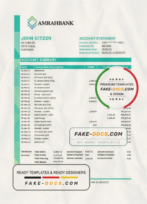 Grab now fully editable Azerbaijan Amrahbank Bank Statement Excel Template from our website Fake Docs and put your own info to create Fake Bank Statement template Excel and ready your own novelty documents. It’ll be so beneficial if your Bank Statement is expired, stolen or not available. We also have passport psd template, ID Card psd template, Bank Statement psd template, drivers license psd template & Utility bill psd template