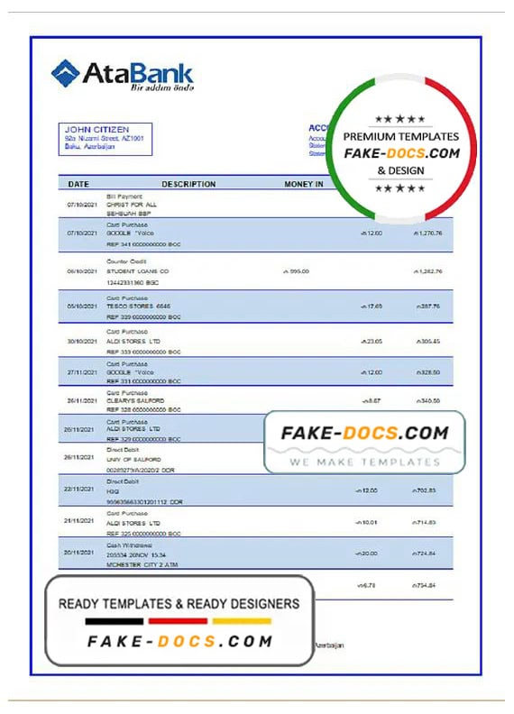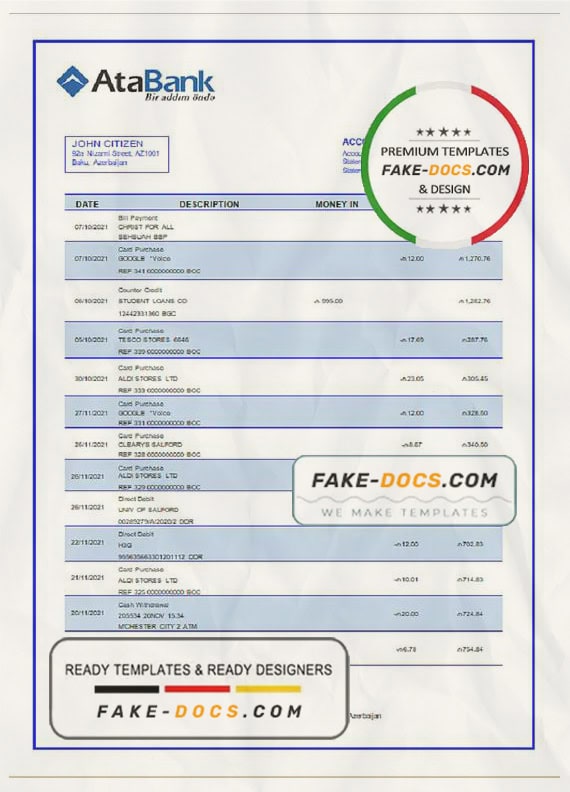 Grab now fully editable Azerbaijan Atabank Bank Statement Word Template from our website Fake Docs and put your own info to create Fake Bank Statement Word template and ready your own novelty documents. It’ll be so beneficial if your Bank Statement is expired, stolen or not available. We also have passport psd template, ID Card psd template, Bank Statement psd template, drivers license psd template & Utility bill psd template
