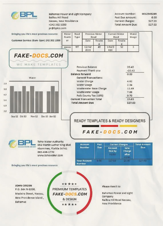 Grab now fully editable Bahamas Power and Light Company utility bill Template from our website fake docs and put your own info to create a fake copy of Fake Bahamas Power and Light Company Utility Bill for proof of address and ready your own novelty documents. It’ll be so beneficial if your utility bill is expired, stolen or not available. We also have passport psd template, ID Card psd template, Bank Statement psd template, drivers license psd template & Utility bill psd template