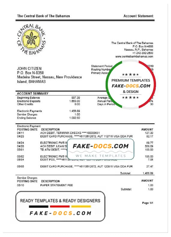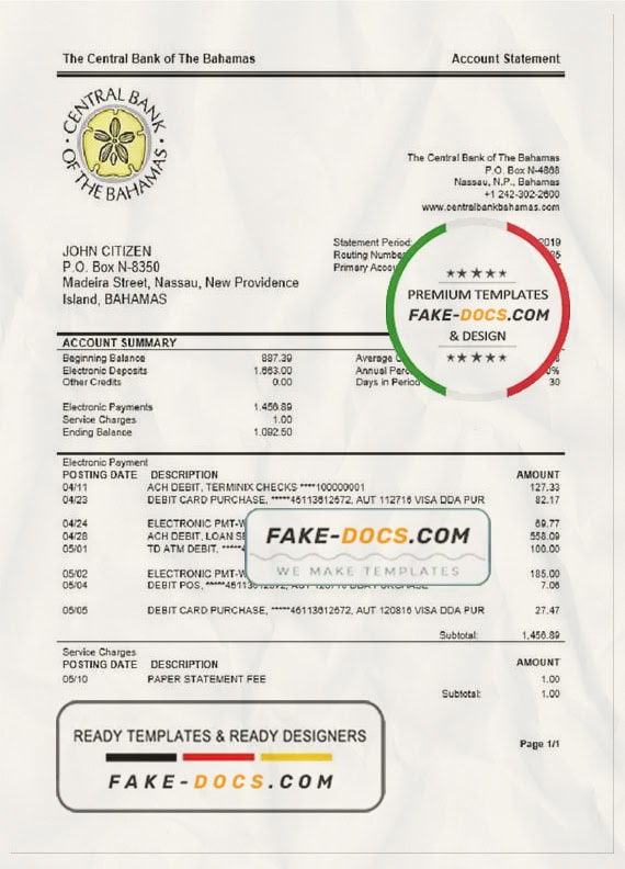 Grab now fully editable Bahamas The Central Bank of The Bahamas Bank Statement Word Template from our website Fake Docs and put your own info to create Fake Bank Statement Word template and ready your own novelty documents. It’ll be so beneficial if your Bank Statement is expired, stolen or not available. We also have passport psd template, ID Card psd template, Bank Statement psd template, drivers license psd template & Utility bill psd template
