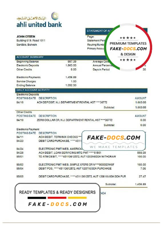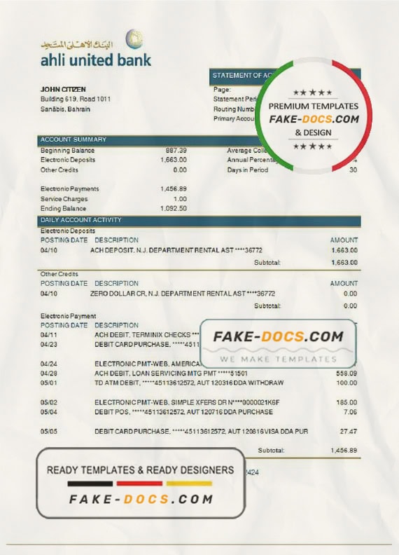 Grab now fully editable Bahrain Ahli United Bank Statement Word Template from our website Fake Docs and put your own info to create Fake Bank Statement Word template and ready your own novelty documents. It’ll be so beneficial if your Bank Statement is expired, stolen or not available. We also have passport psd template, ID Card psd template, Bank Statement psd template, drivers license psd template & Utility bill psd template