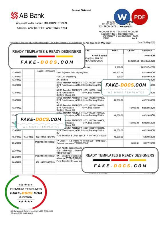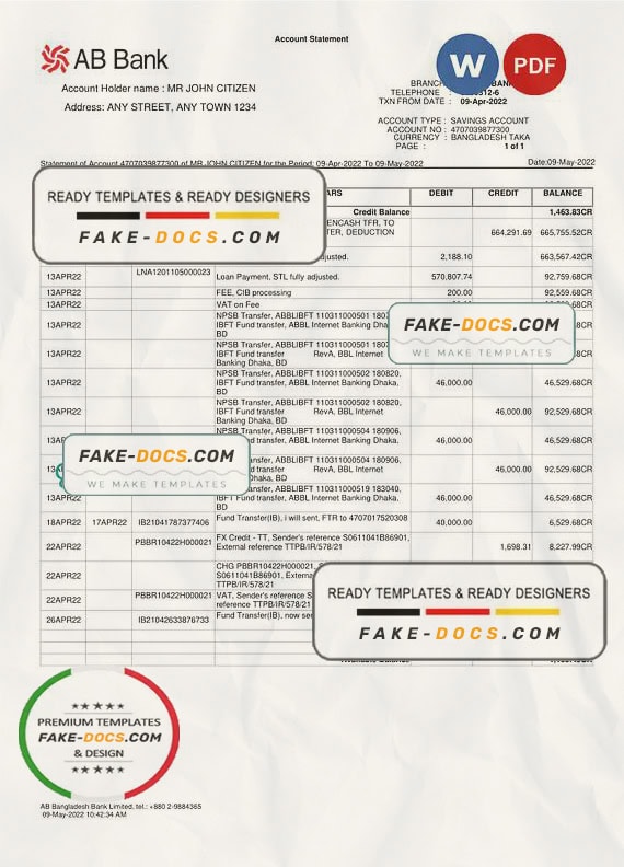 Grab now fully editable Bangladesh AB Bank Statement Word Template from our website Fake Docs and put your own info to create Fake Bank Statement Word template and ready your own novelty documents. It’ll be so beneficial if your Bank Statement is expired, stolen or not available. We also have passport psd template, ID Card psd template, Bank Statement psd template, drivers license psd template & Utility bill psd template