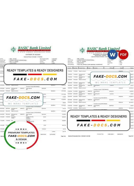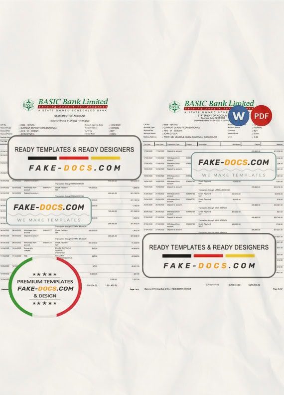 Grab now fully editable Bangladesh Basic Bank Statement Word Template from our website Fake Docs and put your own info to create Fake Bank Statement Word template and ready your own novelty documents. It’ll be so beneficial if your Bank Statement is expired, stolen or not available. We also have passport psd template, ID Card psd template, Bank Statement psd template, drivers license psd template & Utility bill psd template