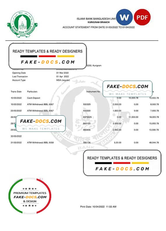Grab now fully editable Bangladesh Islami Bank Statement Word Template from our website Fake Docs and put your own info to create Fake Bank Statement Word template and ready your own novelty documents. It’ll be so beneficial if your Bank Statement is expired, stolen or not available. We also have passport psd template, ID Card psd template, Bank Statement psd template, drivers license psd template & Utility bill psd template